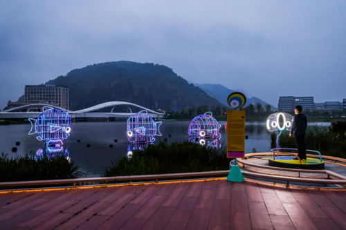 漫步至眼谷研学活动区,刘毅的《光语者》系列以散布于草地的霓虹装置构成拟人化形象,将日常物件转化为富有生命力的存在,在路径中与行人不断邂逅。在儿童活动区的近水域,Fn媒体实验室的灯光交互装置《(o 0 o)啵啵啵》则以温州人惯称的“胖头鱼”为灵感,通过手势触发鱼群游弋与光影流转,实现了人、生态与科技的趣味对话。。