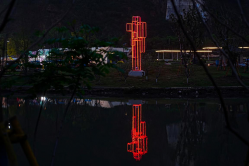 黄石山公园的西入口处,瑞士艺术家克劳蒂亚·孔德(Claudia Comte)带来巨型充气装置《闪电交响曲》,在山水之间构建出震撼的“音浪场域”;沿步行桥漫步至近水域,艺术家;C(分号C)的《涟漪与涟漪》以数字媒介捕捉水波涟漪的瞬时形态,营造出虚实交错的流动景观。公园的花海区域,荷兰艺术家伊沃·斯库夫斯丨动态幽默(Ivo Schoofs丨Kinetic Humor)的《光标》以鼠标指针介入蓝天,将天空化为自然屏幕,呼吁市民从手机屏幕回归广阔自然;来到半弧形草坪处,沈烈毅的《跷跷板·源》则以互动装置引水循环,构建了一个充满诗意的自然循环系统。